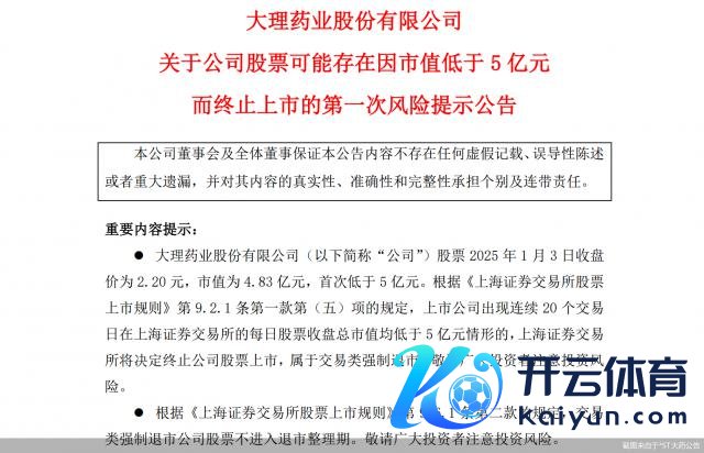 具体来看,*ST 大药公告清晰,公司股票 1 月 3 日收盘价为 2.2 元 / 股,市值为 4.83 亿元,初次低于 5 亿元。把柄《上海证券往还所股票上市执法》第 9.2.1 条第一款第(五)项的法例,上市公司出现承接 20 个往未来在上交所的逐日股票收盘总市值均低于 5 亿元情形的,上交所将决定阻隔公司股票上市。