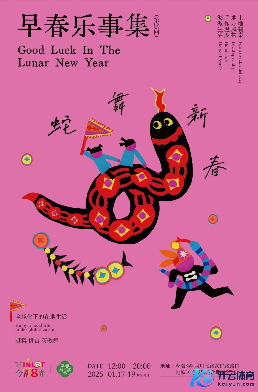 1月17日至1月19日,早春乐事集将总结滨港今潮8弄,以“蛇舞新春”为题,会聚海派生涯、手作温度、地点情状、地盘餐桌等早春四大板块100余位生涯艺术家,更邀请到有130余年历史的潮阳棉北后溪英歌队带来声势磅礴的潮汕英歌舞献技,呈现极具炊火气的赶集体验。