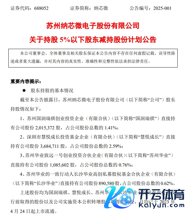 据先容,上述股份均为国润瑞祺、慧悦成长、苏州华业、长沙华业于纳芯微初次公建筑行前得回的股份以及推论成本公积转增股本得回的股份,且均已于2023年4月24日起上市畅达。