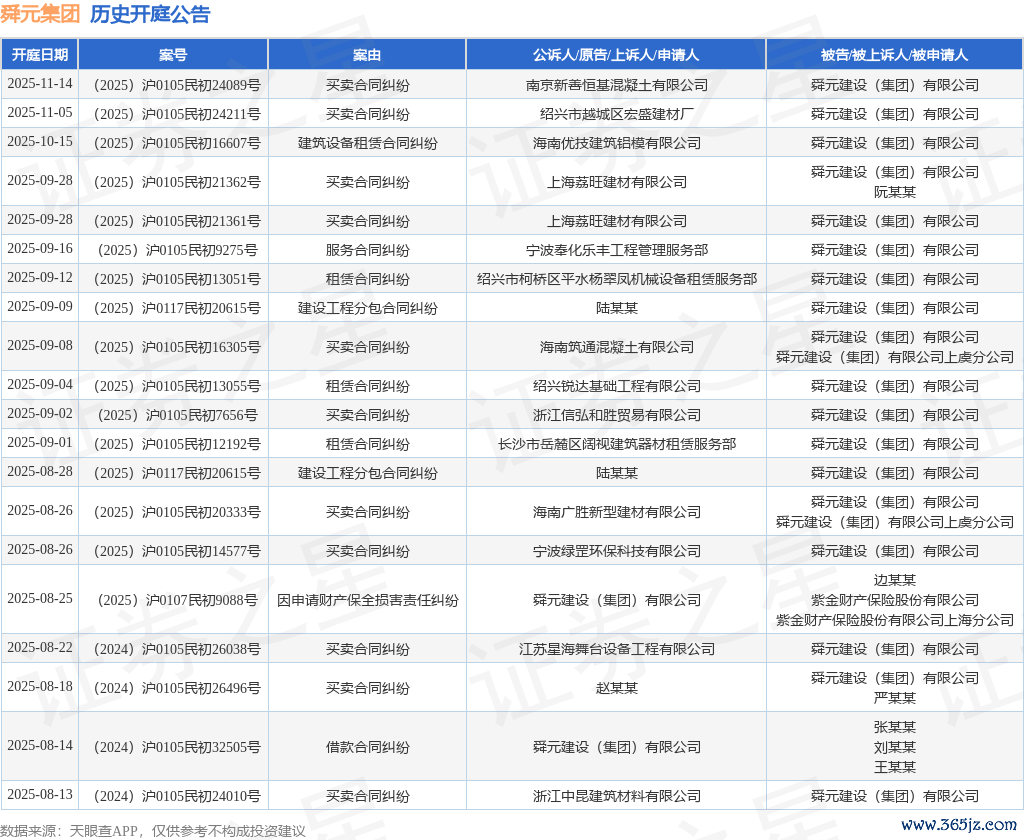 案号:(2025)浙0381民初11287号审理法院:瑞安市东谈主民法院案由:建造工程施工条约纠纷当事东谈主信息: 原告/上诉东谈主:舜元建造(集团)有限公司 被告/被上诉东谈主:瑞安市中宝置业有限公司开庭日历:2025年8月12日凭证统计,近一年内以舜元建造(集团)有限公司为当事东谈主的历史开庭公告有193则,其中案由为“交易条约纠纷”的公告以65则居首,其次为“建造工程施工条约纠纷”有32则,“建造工程分包条约纠纷”有25则。历史开庭公告(前20条)如下: