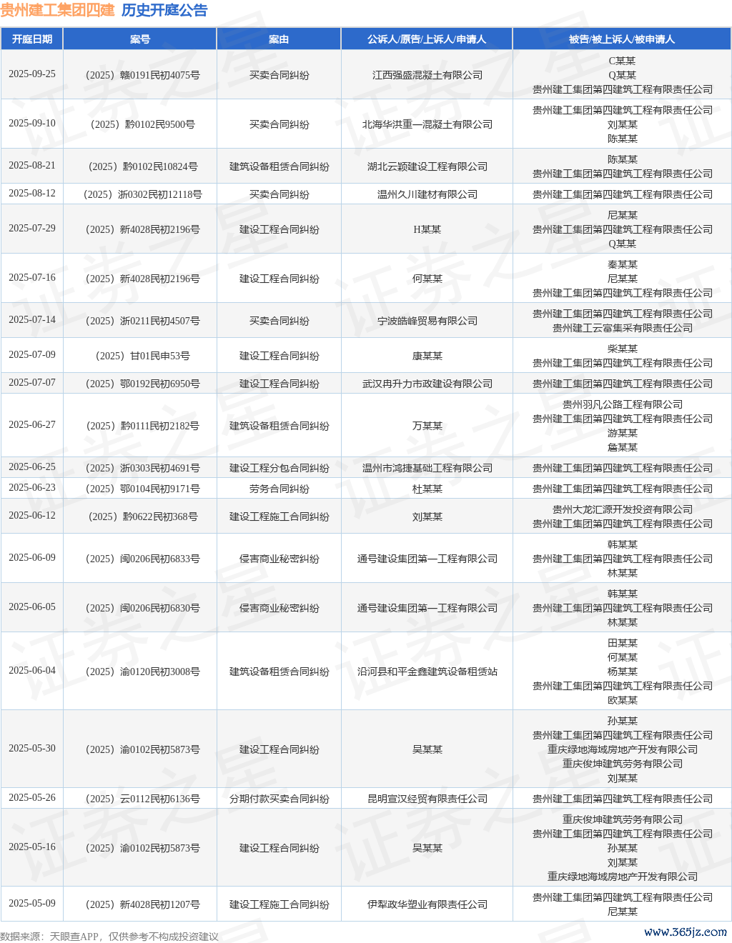 案号:(2025)浙0302民初12118号审理法院:温州市鹿城区东说念主民法院案由:营业协议纠纷当事东说念主信息: 原告/上诉东说念主:温州久川建材有限公司 被告/被上诉东说念主:贵州建工集团第四建筑工程有限包袱公司开庭日历:2025年8月12日阐述统计,近一年内以贵州建工集团第四建筑工程有限包袱公司为当事东说念主的历史开庭公告有76则,其中案由为“树立工程施工协议纠纷”的公告以24则居首,其次为“营业协议纠纷”有12则,“树立工程协议纠纷”有11则。历史开庭公告(前20条)如下: