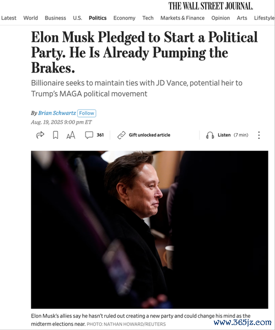 《华尔街日报》对于马斯克住手鼓动确立“好意思国党”报说念的截图。